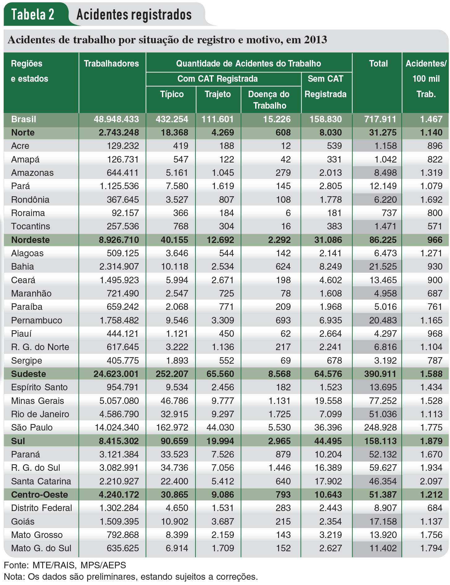 A Região Sudeste segue liderando as estatísticas de acidentes e óbitos laborais no país (veja Tabelas 2 e 4). Mais da metade dos acidentes registrados em 2013 (390.911 ou 54,45% do total) e quase a metade das mortes (1.327 ou 47,44% do total) ocorreram no Sudeste. Juntos, os quatro estados da região concentram 50,3% da mão de obra formal, totalizando 24.623.001 trabalhadores.