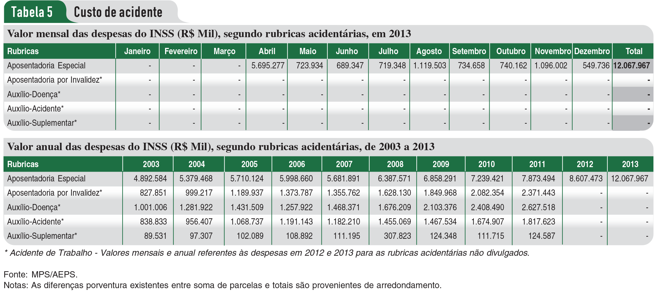 A exemplo do que aconteceu em 2012, o AEPS divulgou somente o total gasto em 2013 com aposentadoria especial (R$ 12.067.967.000) e omitiu os totais gastos com aposentadoria por invalidez, auxílio-doença, auxílio-acidente e auxílio-suplementar. Ou seja, com exceção dos valores de aposentadoria especial, divulgados até 2013, o restante foi divulgado somente até 2011 e permanece uma incógnita nos anos de 2012 e 2013, conforme mostra a Tabela 5.
