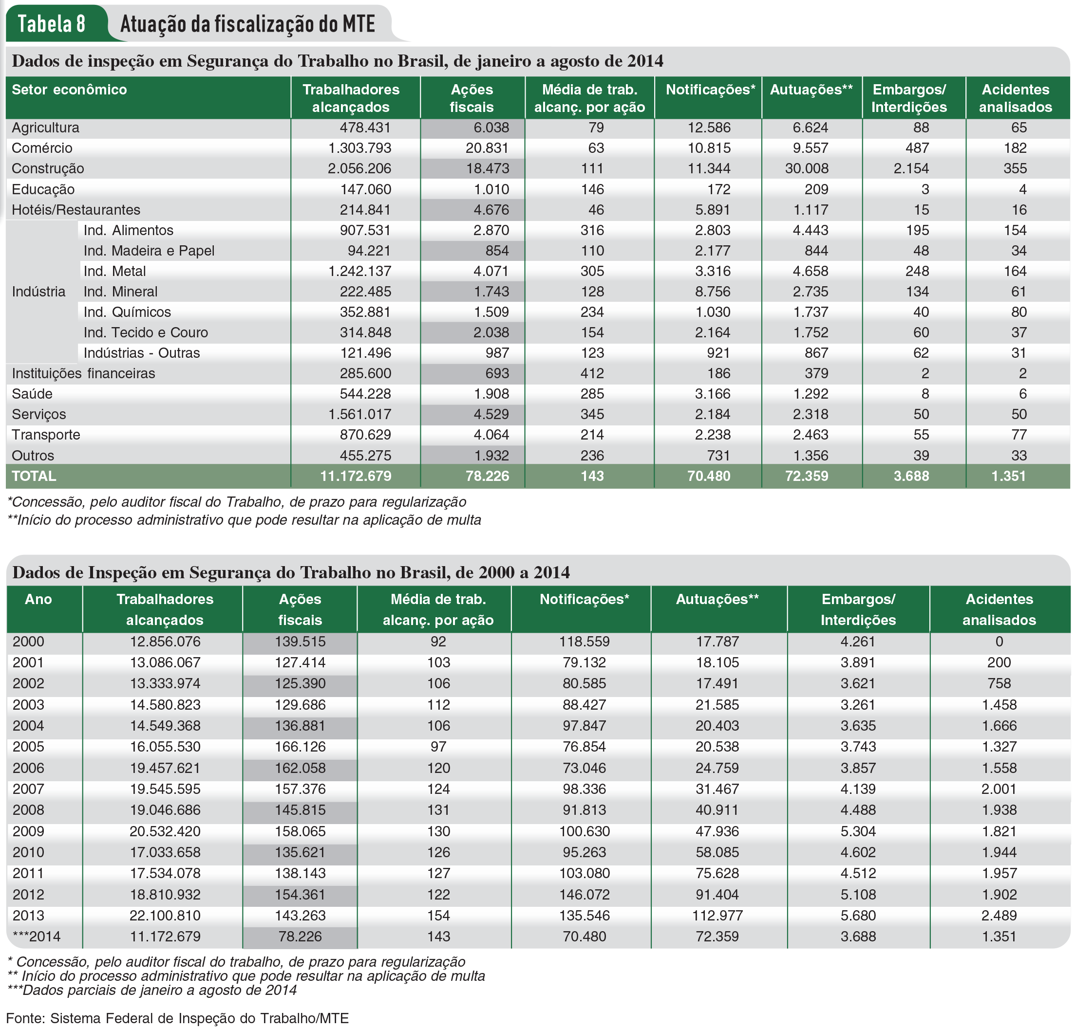 Analisando os dados da Fiscalização do Trabalho fornecidos pelo Sistema Federal de Inspeção do Trabalho (veja Tabela 8), verifica-se que as 143.263 ações fiscais empreendidas em 2013 (redução de 7,19% em relação a 2012), apesar de menos numerosas, tiveram resultados mais expressivos. O contingente de 22.100.810 trabalhadores alcançados pelas ações fiscais em 2013 representa quase a metade (45,15%) dos 48.948.433 trabalhadores com carteira assinada deste mesmo ano e é o maior número contabilizado pela Fiscalização desde 2000 (acréscimo de 17,49% em relação a 2012).